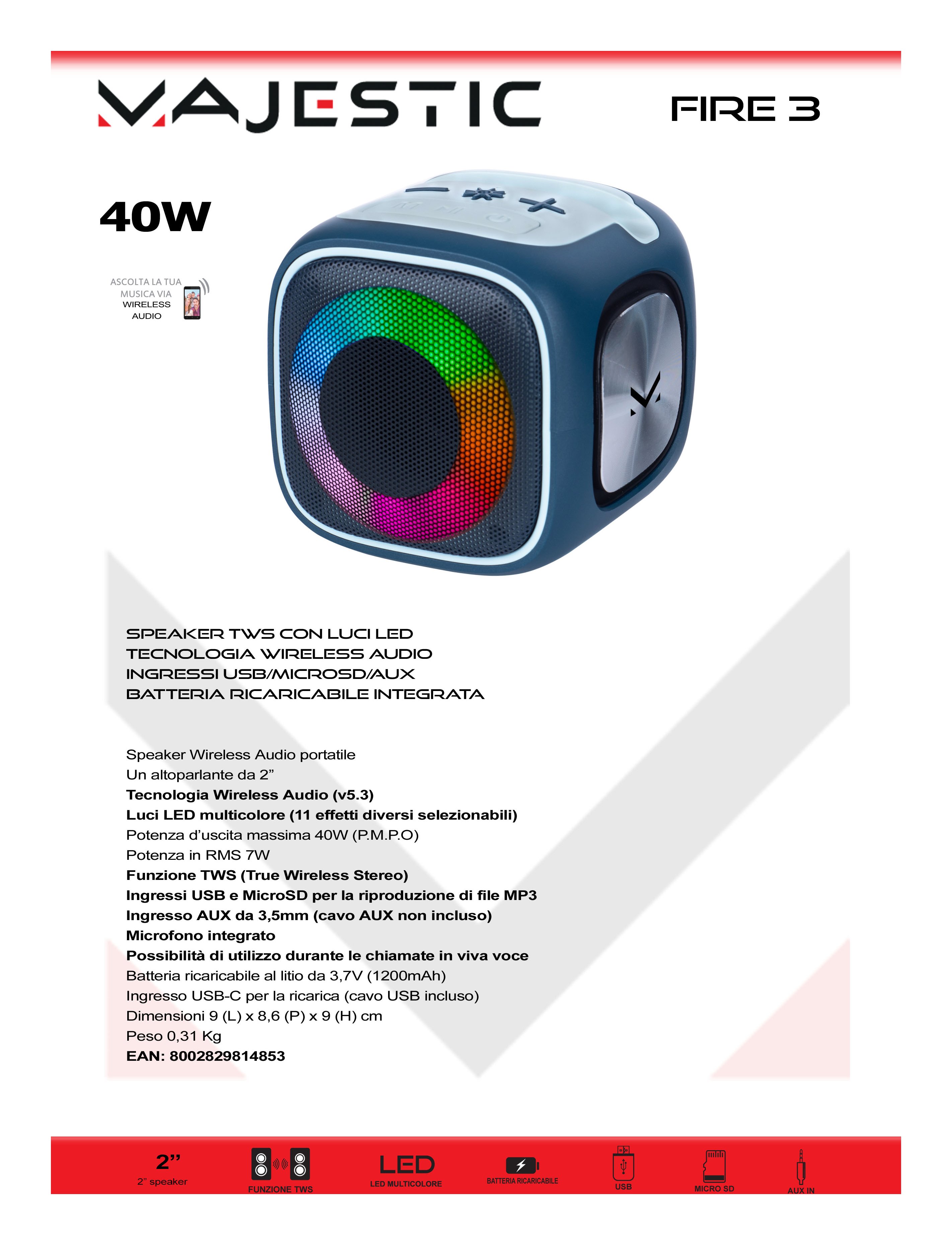 Speaker tws con luci led e con ingressi USB, MicroSD e Aux. Microfono integrato.