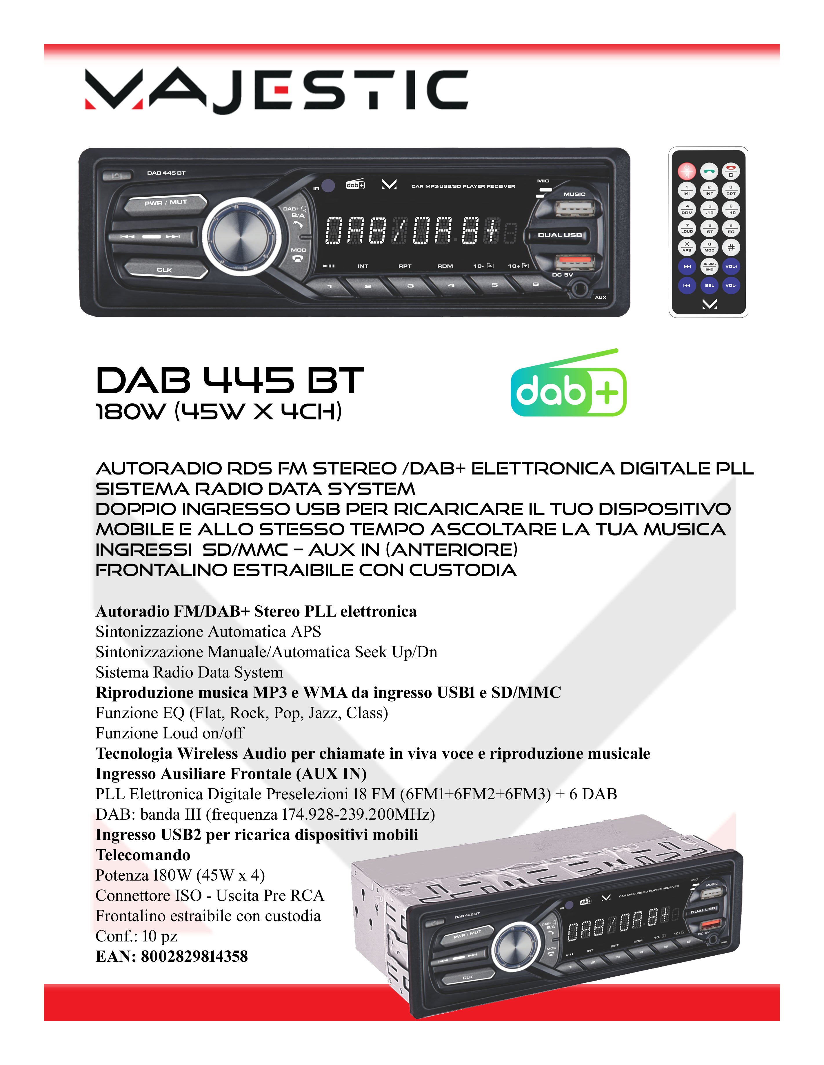 L'autoradio DAB 445 BT MAJESTIC dispone di un doppio sintonizzatore radio (analogico FM + digitale DAB+) per non perdere mai la tua stazione preferita. La DAB 445 BT MAJESTIC ti permette anche di ascoltare tutta la tua musica direttamente dal tuo Smartphone o dai dispositivi digitali come chiavette USB, schede di memoria MicroSd, oppure da ingresso AUX. Per la massima sicurezza dispone di un frontalino estraibile con comoda custodia e di un pratico telecomando con accesso a tutte le funzioni operative, sia per la parte audio (equalizzatore / loudness), che per la parte viva voce ( volume, rispondi etc ). Nessun problema anche durante le tue chiamate che potrai fare in viva voce senza distrazioni grazie al microfono incorporato. Potenza totale 180W su 4 canali, dimensione 1Din e porta USB dedicata alla ricarica del tuo dispositivo (5V)