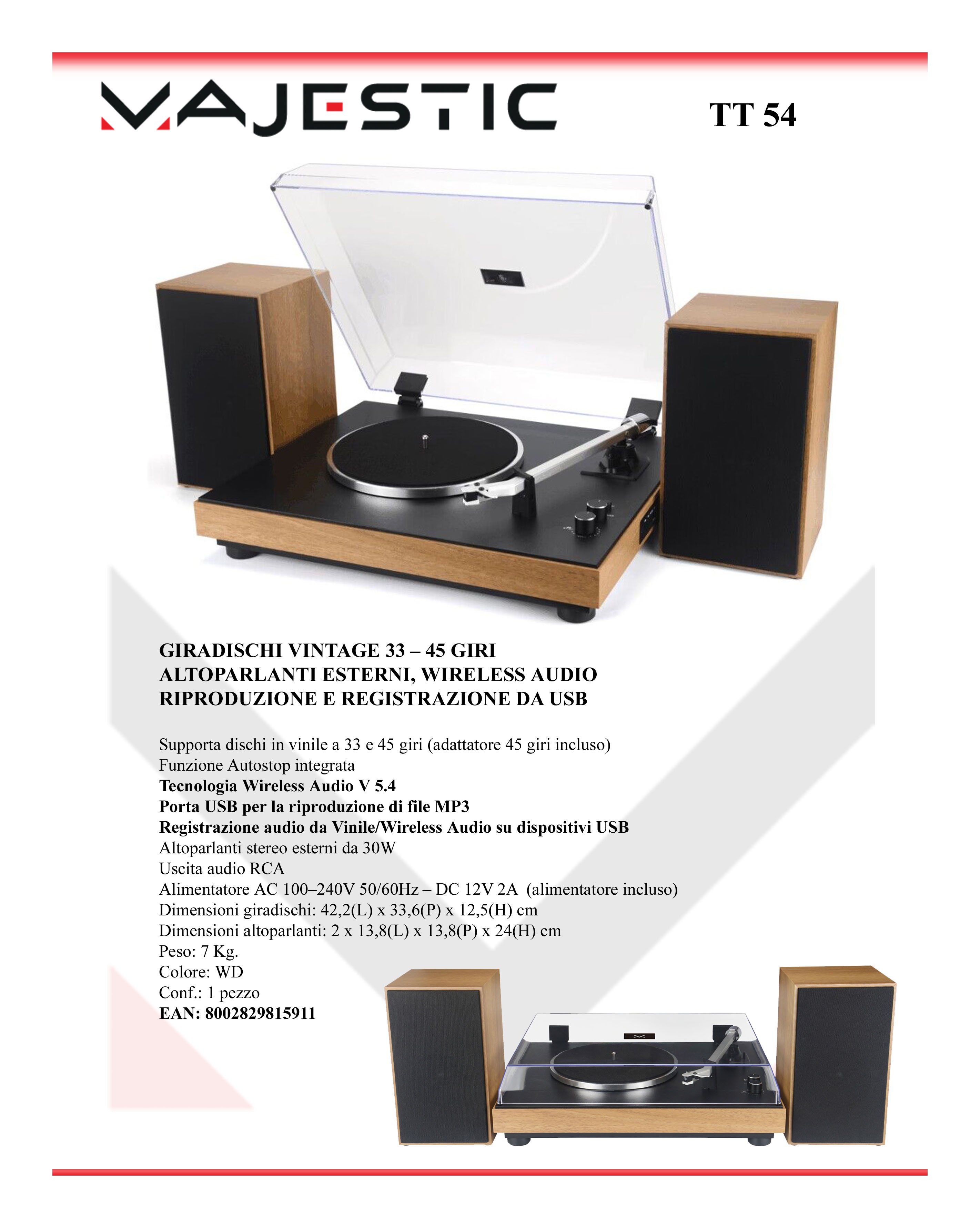 Il MAJESTIC TT 54 WD è un elegante giradischi con corpo in legno e piatto stabilizzato che ti permetterà di ascoltare al meglio la tua collezione di vinili. Le sue casse sono ben bilanciate ed esterne per darti la possibilità di collocarle nel punto migliore in base alla tua abituale postazione di ascolto. Riproduce dischi sia 45 che 33 giri, ma tramite la connessione wireless audio puoi anche ascoltare la musica da altri dispositivi come telefono o tablet. Per i più esigenti è anche possibile fare il Ripping dei vinili e quindi riversali in digitale su una chiavetta USB per poi ascoltarli su tutti i dispositivi moderni. Infine una pratica uscita audio con connessine RCA potrà allargare i confini dei tuoi vinili ad un impianto già esistente.
