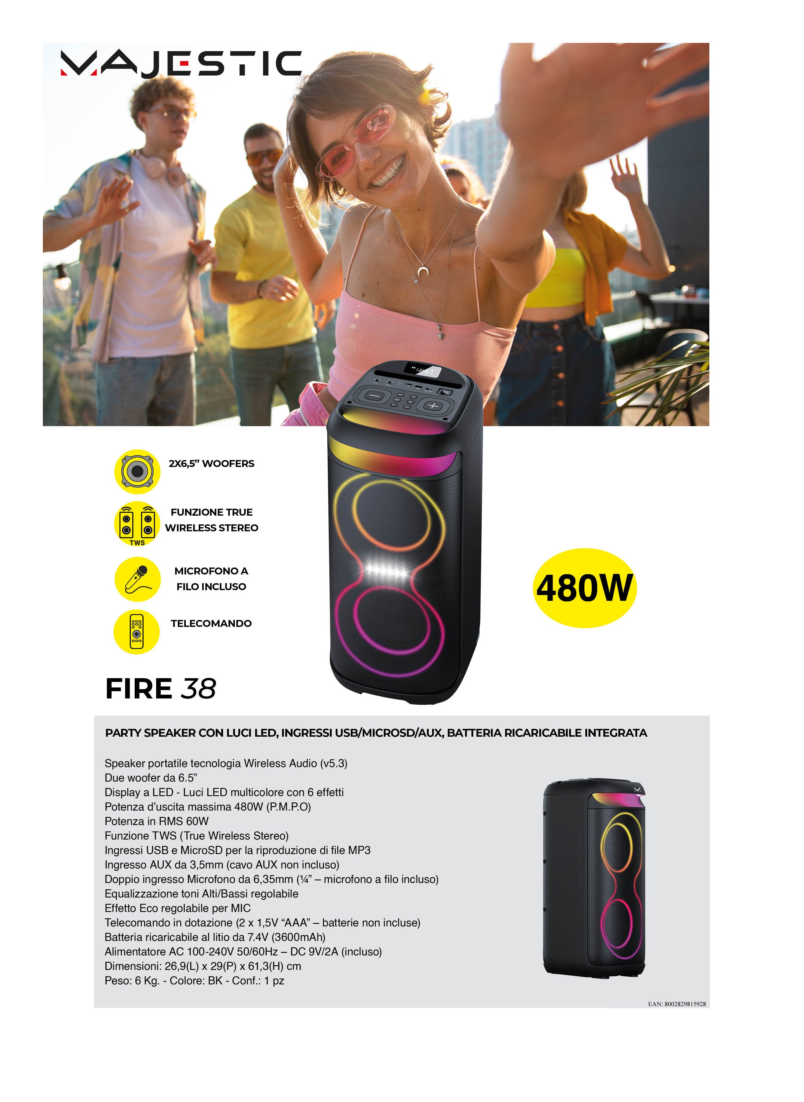 Majestic Set karaoke FIRE 38 Tws Black 60W 116138 BK Bluetooth Jack 6,3mm, USB, MicroSD, AUX