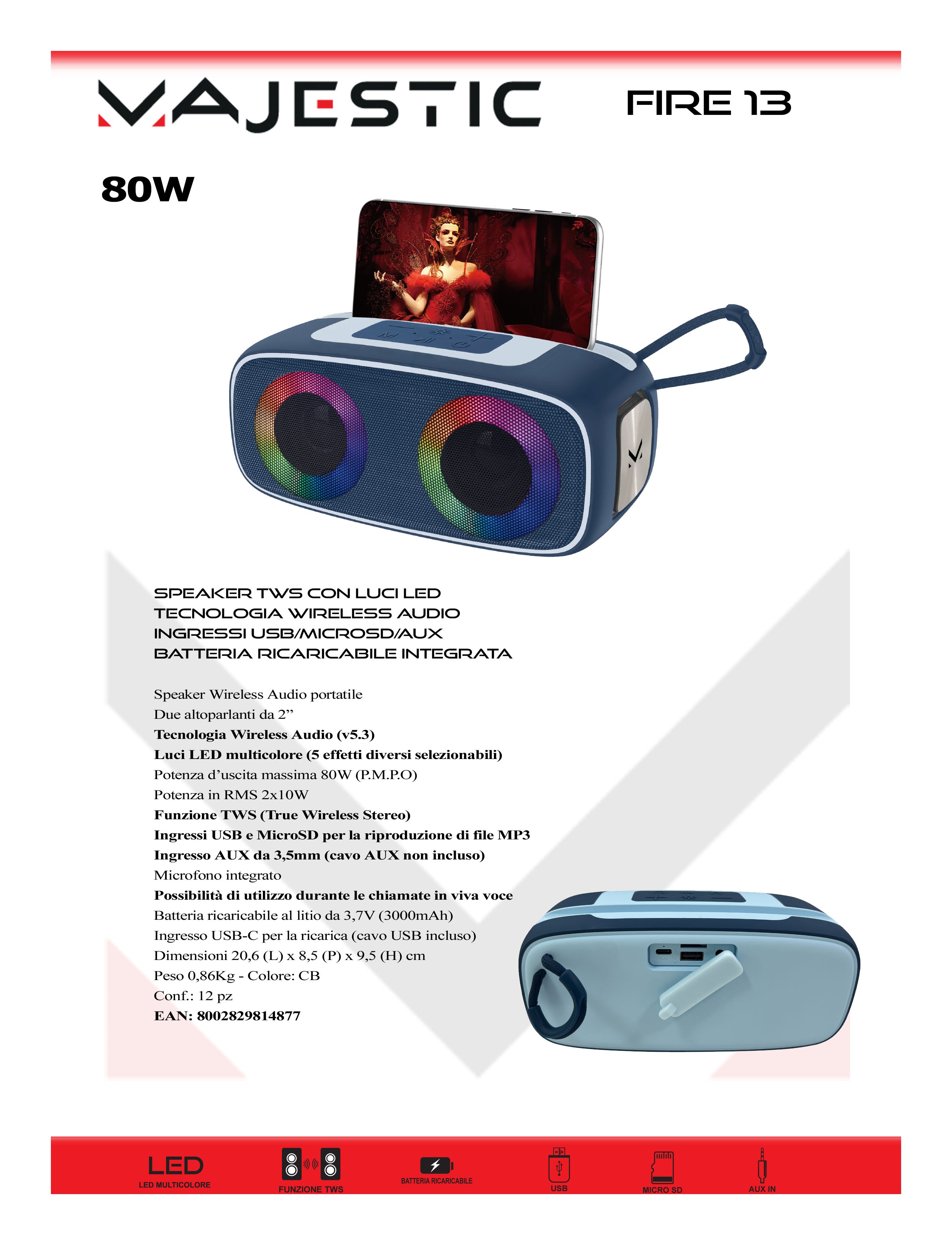 Il Party Speaker MAJESTIC FIRE 13 è il compagno ideale per le tue feste! Le luci LED multicolore, con 5 effetti selezionabili, creano l’atmosfera perfetta.