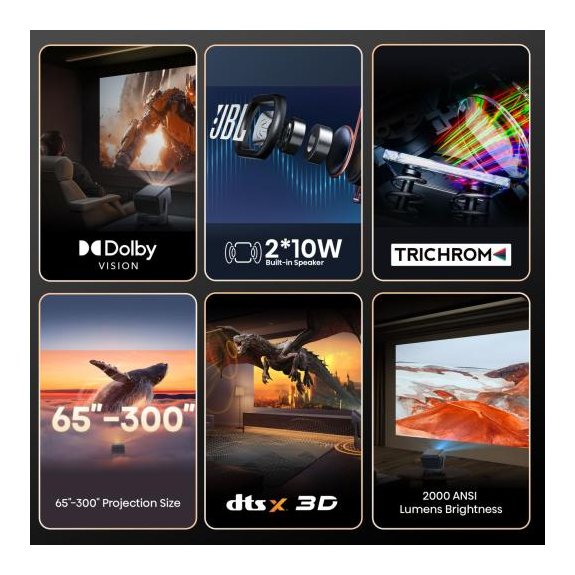 Crea l'esperienza visiva definitiva. Questo proiettore si adatta a qualsiasi dimensione dello schermo da 65" a 300", quindi puoi proiettare su un muro nel tuo soggiorno o su uno schermo gigante nel tuo giardino.