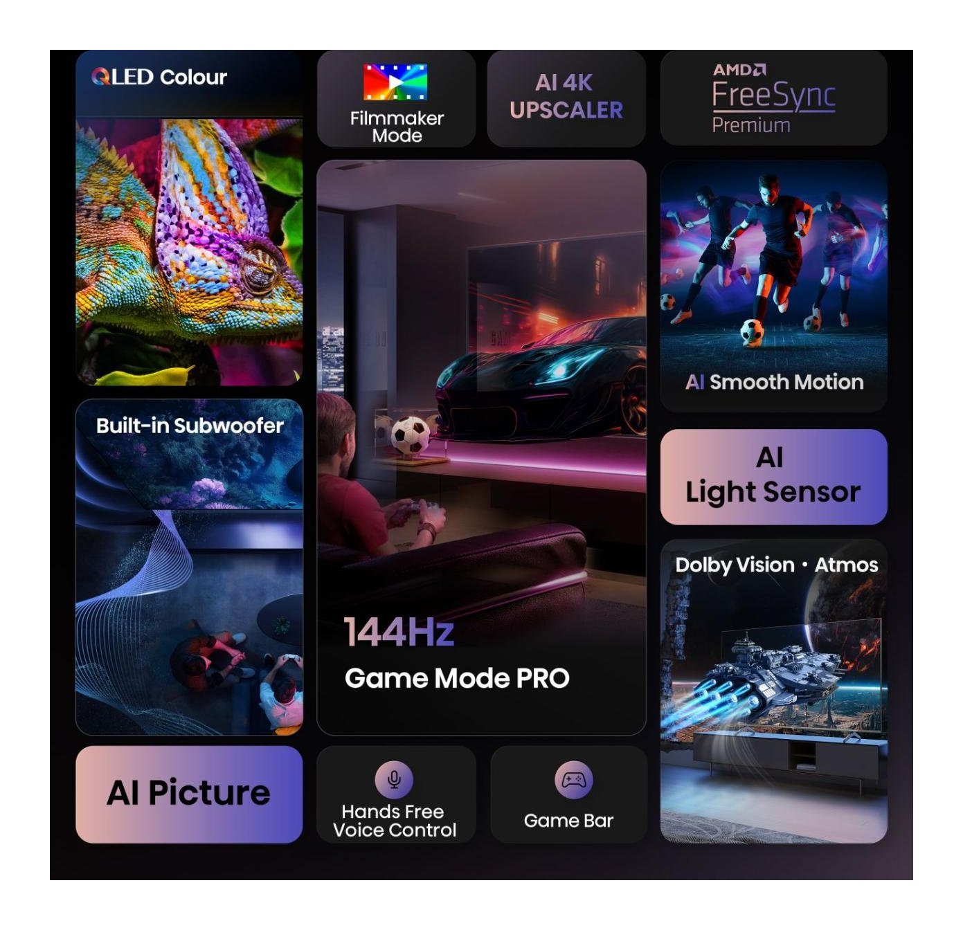 Vivi un'esperienza visiva indimenticabile con QLED Colour. Ogni immagine è ricca, vibrante e realistica, assicurando che ogni colore, dal più tenue al più vibrante, si distingua.