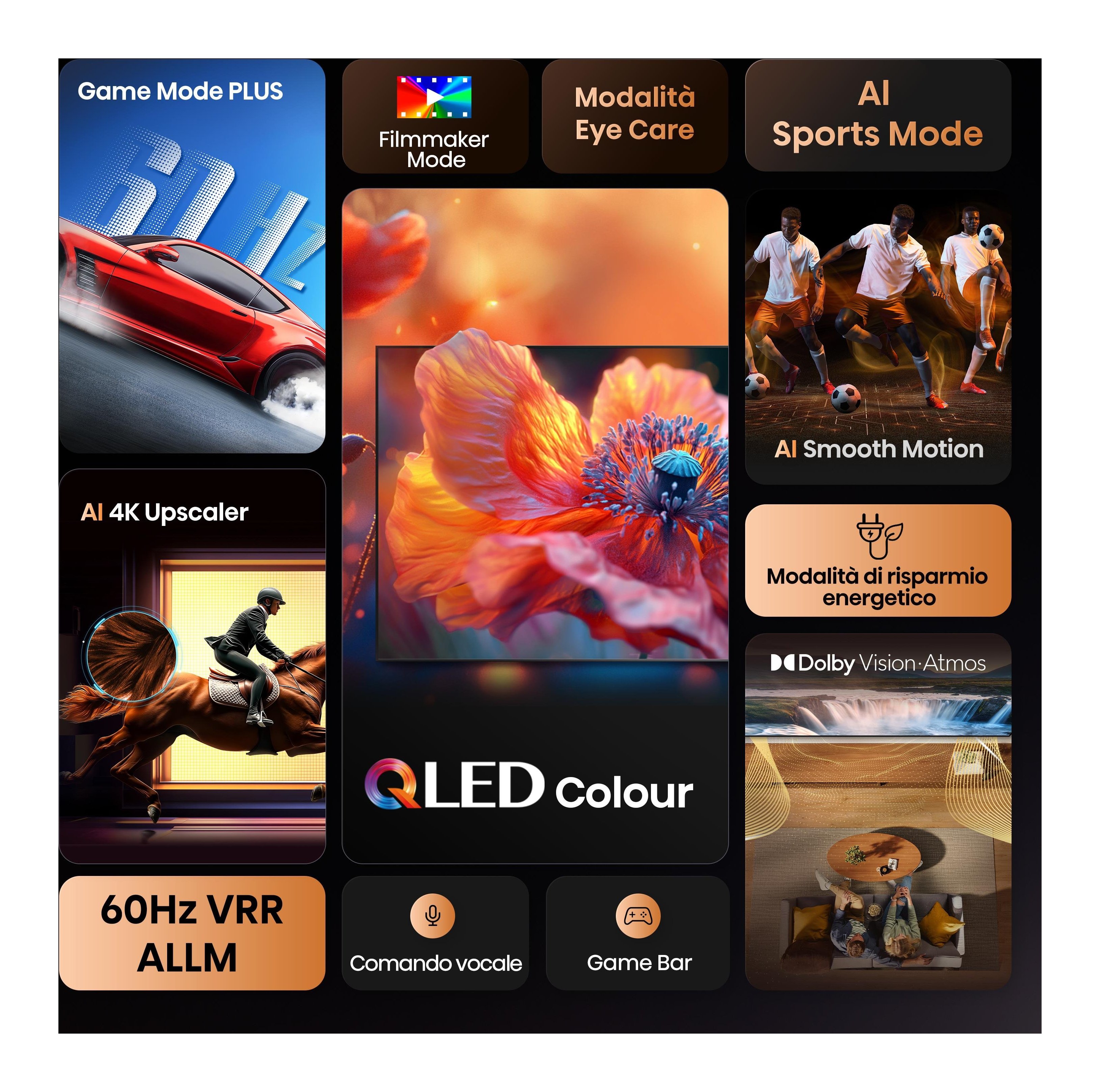Vivi un'esperienza visiva indimenticabile con QLED Colour. Ogni montatura è ricca, vibrante e realistica, assicurando che ogni colore, dal più tenue al più vibrante, si distingua.