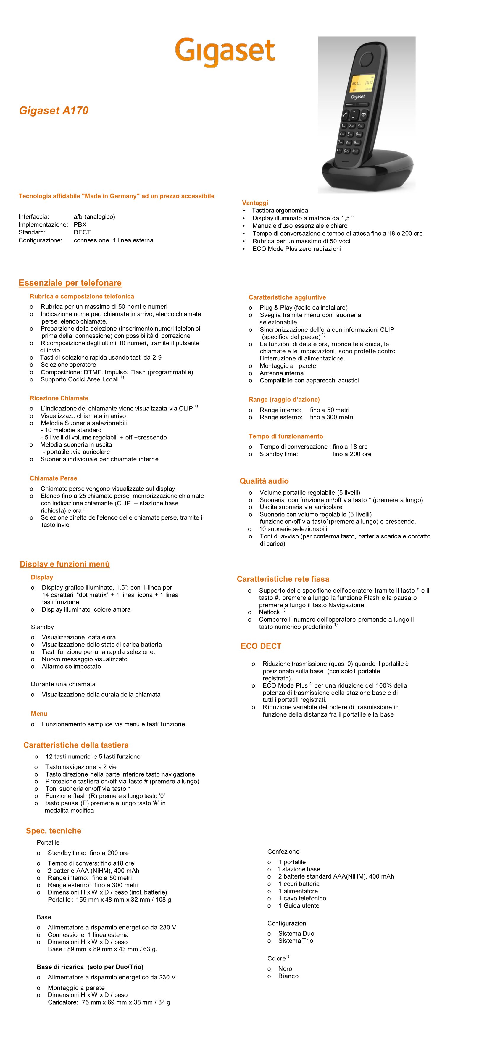 Gigaset Cordless Singolo A SERIES A170 Bianco S 30852 H2802 K102