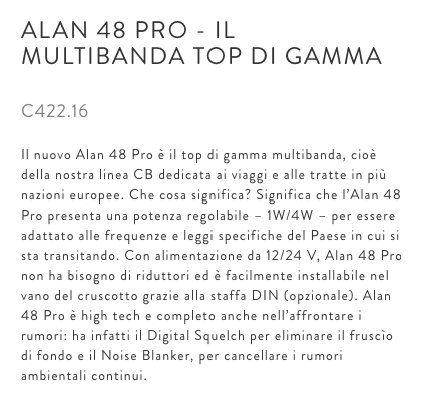 Il nuovo Alan 48 Pro è il top di gamma multibanda, cioè della nostra linea CB dedicata ai viaggi e alle tratte in più nazioni europee. Che cosa significa? Significa che l’Alan 48 Pro presenta una potenza regolabile – 1W/4W – per essere adattato alle frequenze e leggi specifiche del Paese in cui si sta transitando. Con alimentazione da 12/24 V, Alan 48 Pro non ha bisogno di riduttori ed è facilmente installabile nel vano del cruscotto grazie alla staffa DIN (opzionale). Alan 48 Pro è high tech e completo anche nell’affrontare i rumori: ha infatti il Digital Squelch per eliminare il fruscìo di fondo e il Noise Blanker, per cancellare i rumori ambientali continui.