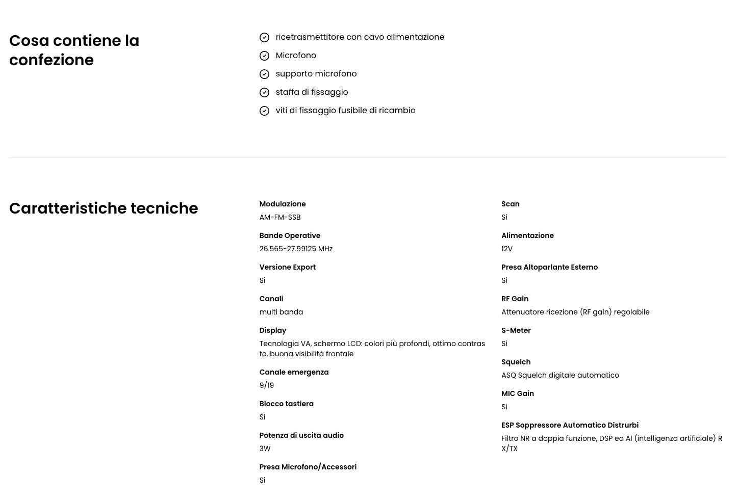 Un tempo utilizzata anche per le comunicazioni intercontinentali da casa, la modulazione SSB torna protagonista in una versione compatta, perfetta per l’installazione su veicoli. La potenza e la qualità dell’SSB sono accessibili anche on the road, senza compromessi. Il nuovo ampio LCD multicolore da 4 pollici con tecnologia VA ti offre una visione nitida e ricca di contrasto, perfetta in ogni condizione di luce. Il cuore tecnologico del dispositivo è il filtro NR a doppia funzione, che unisce la potenza del DSP (elaborazione digitale del segnale) all’efficienza dell’intelligenza artificiale, per ridurre al minimo i disturbi sia in ricezione che in trasmissione. Non mancano funzioni evolute ilVOX regolabile su 9 livelli, per parlare in libertà senza premere alcun pulsante. La funzione ECHOamplifica la chiarezza della tua voce, rendendoti sempre comprensibile anche in ambienti rumorosi. E per proteggere il tuo apparato, la funzione SWR personalizzabile ti avvisa e protegge in caso di errata taratura dell’antenna. Inoltre, grazie ai subcanali CTCSS/DCS, puoi comunicare in modo più discreto e protetto da interferenze.