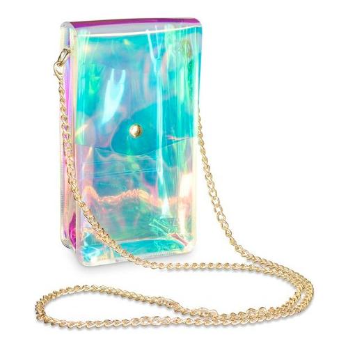 HOLOGRAPHIC BAG è la custodia universale da indossare a tracolla per avere sempre con sé il proprio smartphone. Semi-trasparente con effetto iridescente che cambia colore a seconda della luce, è dotata di tracolla in metallo dorato abbinata al bottone di chiusura. Le due tasche interne consentono di riporre carte e monete. Pratica e funzionale, regala un tocco di stile ad ogni outfit!