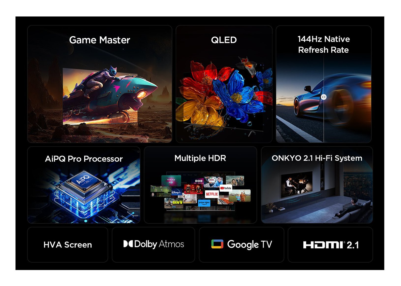 I TV QLED di TCL utilizzano Colorful Quantum Crystal, che integrano materiali a punti quantici su scala nanometrica con materiali organici in più strati. Insieme alla tecnologia di retroilluminazione, questa innovazione consente di ottenere prestazioni cromatiche e ottiche eccezionali. Ogni fotogramma riproduce magistralmente oltre un miliardo di sfumature di colori vividi e perfetti, offrendo immagini straordinariamente intense. La luminosità potenziata mette ulteriormente in risalto i dettagli più sottili, regalando un’esperienza visiva immersiva e realistica che svela ogni sfumatura nascosta.