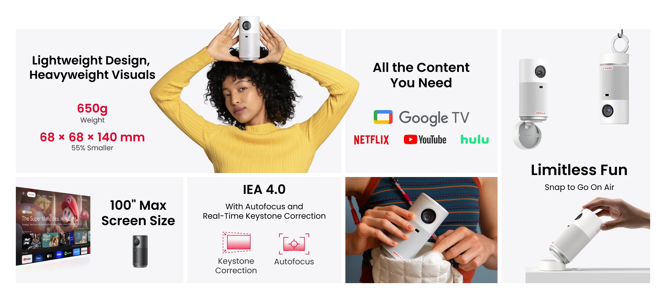 Dimensioni di una lattina per una portabilità senza limiti: il design ultracompatto e leggero si adatta perfettamente alla mano, così puoi portare il tuo intrattenimento ovunque. Viaggia liberamente con 2 ore di riproduzione integrata: guarda un film intero o diversi episodi del tuo programma preferito ovunque ti trovi, grazie alla batteria integrata da 34 Wh.