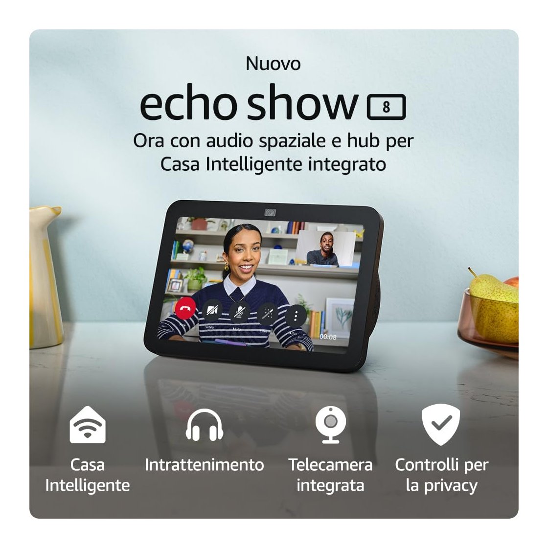 Echo Show 8 offre un’audio spaziale migliore, che avvolge la stanza con un suono più fedele, chiamate più nitide grazie alla videocamera centrale con inquadratura automatica e una gestione migliore della Casa Intelligente grazie all’hub per Casa Intelligente integrato. Il tutto su uno schermo touch HD da 8”.