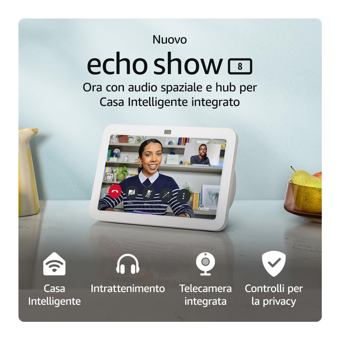 Echo Show 8 offre un’audio spaziale migliore, che avvolge la stanza con un suono più fedele, chiamate più nitide grazie alla videocamera centrale con inquadratura automatica e una gestione migliore della Casa Intelligente grazie all’hub per Casa Intelligente integrato. Il tutto su uno schermo touch HD da 8”.