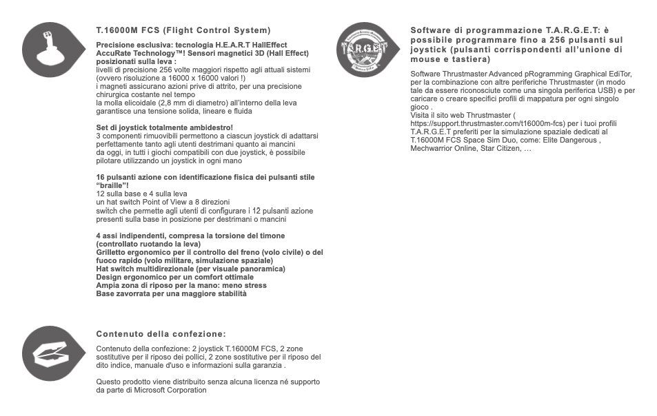 Il Thrustmaster T.16000M FCS Space Sim Duo combina tra loro due joystick Thrustmaster T.16000M FCS, permettendo ai giocatori di giocare utilizzando entrambe le mani, per una sensazionale esperienza di simulazione spaziale.