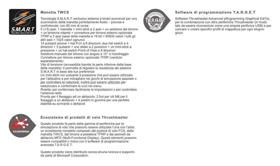 La manetta TWCS (Thrustmaster Weapon Control System) è stata concepita per gli appassionati di simulazione di volo più esperti, alla ricerca di una manetta completa, ergonomica, confortevole e precisa, per una realistica immersione nei giochi.