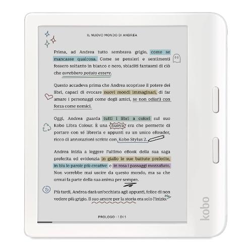 Ti presentiamo il nostro eReader più creativo fino ad ora: il nuovo Kobo Libra Colour. Anima le tue note a margine, dai forma ai tuoi pensieri e sottolinea le frasi più suggestive, tutto a colori. Grazie alla compatibilità con Kobo Stylus, puoi immergerti ancora più profondamente nelle pagine dei tuoi testi preferiti, annotando i contenuti salienti e sottolineando i passaggi più intensi dei tuoi eBook.