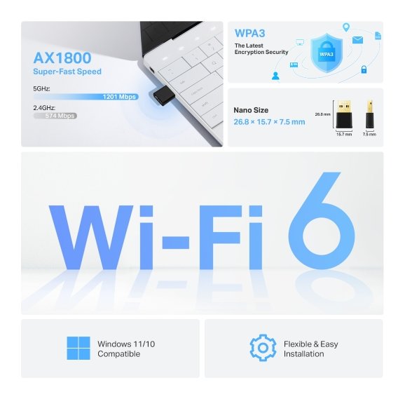 Le prestazioni Wi-Fi del tuo PC sono insufficienti e il tuo lavoro e i momenti di svago ne risentono? Non acquistare un nuovo computer, potenzia il tuo con Archer TX1800U Nano e sfrutta appieno la velocità del tuo router Wi-Fi 6. Goditi una connettività Wi-Fi di livello superiore con velocità di connessione Dual Band fino a 1800Mbps.