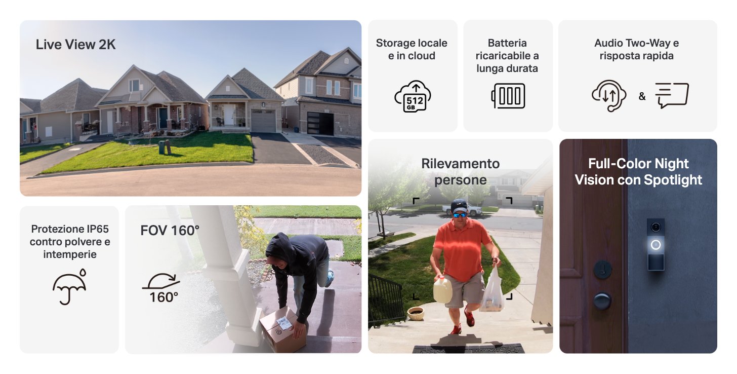 Video campanello smart 2K a batteria. Un campo visivo diagonale di 160° offre una copertura eccezionale, assicurandoti di vedere tutto dalla testa ai piedi in un'unica scansione ininterrotta. La batteria ricaricabile da 6400 mAh offre ore di autonomia, permettendoti di liberarti da cavi e prese di corrente. L'audio bidirezionale ad alta definizione ti consente di parlare direttamente con gli ospiti o con i corrieri.
