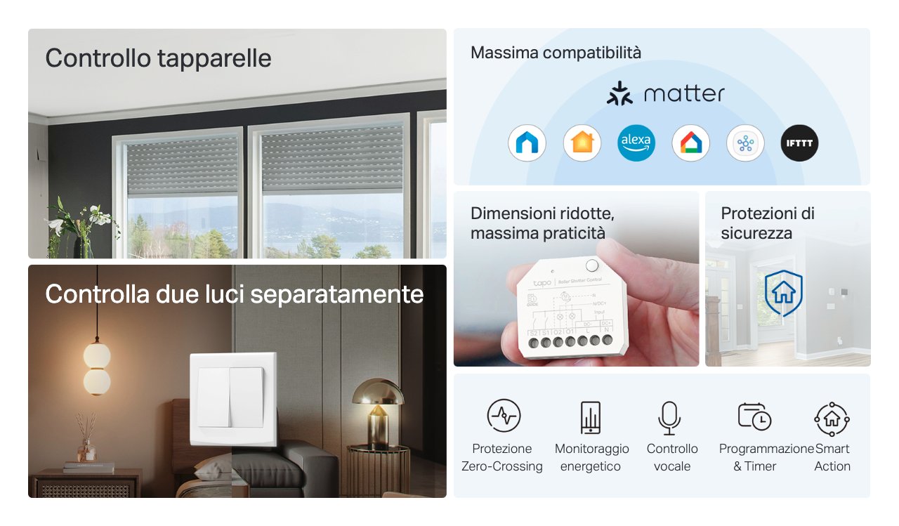 Tapo S112 supporta due modalità che consentono di integrare diversi dispositivi: la modalità roller è ideale per automatizzare le tapparelle, mentre la modalità interruttore controlla luci, prese elettriche e sistemi di riscaldamento a pavimento elettrici, senza necessità di cambiare l'attrezzatura pre-esistente.