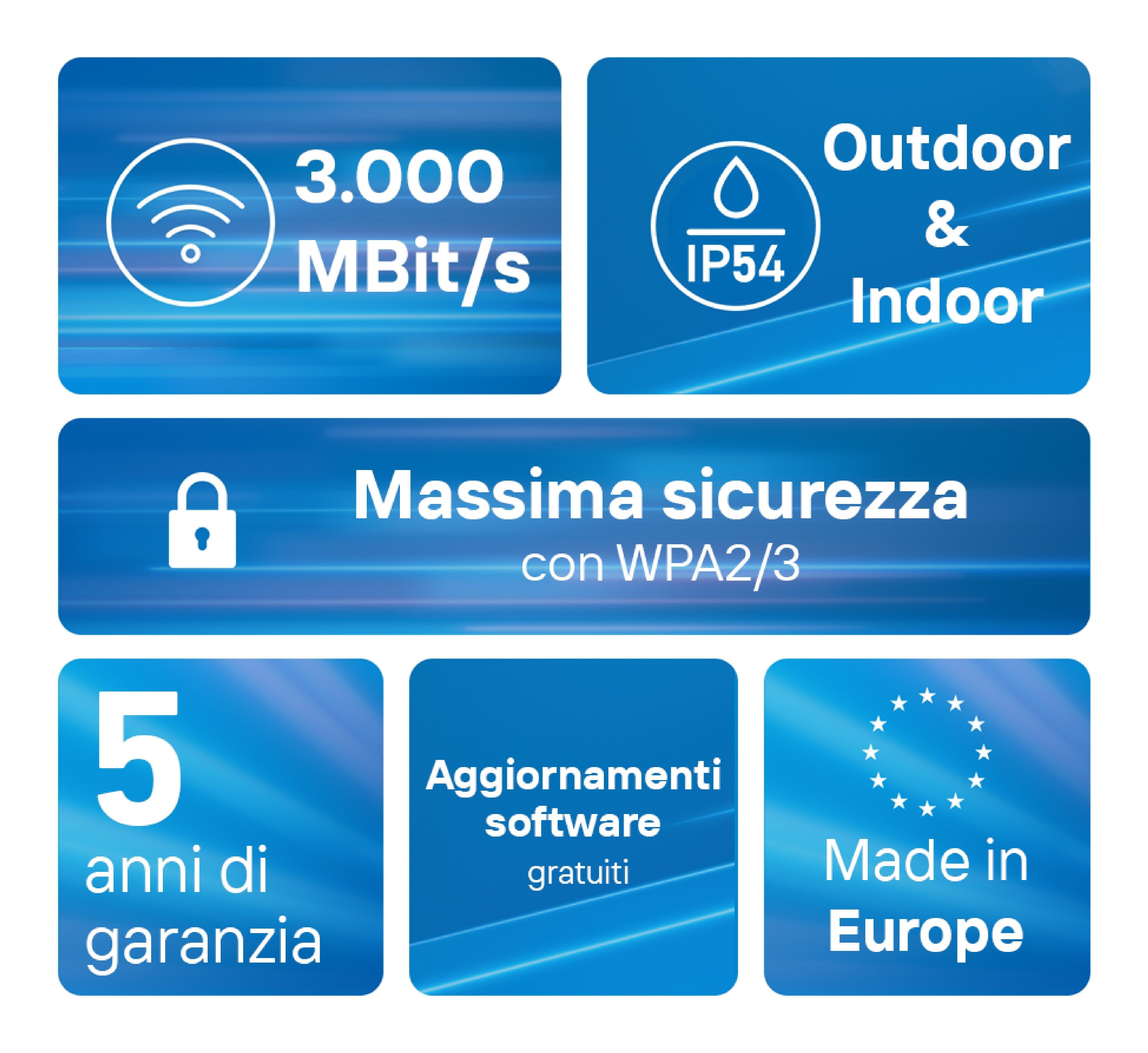 Estensione della portata della rete Wi-Fi in casa e in giardino in modo rapido e semplice. Custodia protetta dalla polvere e dagli spruzzi d'acqua (IP54) per un utilizzo al chiuso e in aree esterne protette.