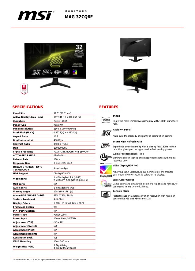 Visualizza la tua vittoria con il monitor da gioco MSI MAG 32CQ6F. Dotato di una frequenza di aggiornamento di 180 Hz, pannello con tempo di risposta di 0,5 ms (GtG, Min.), MAG 32CQ6F ti darà il vantaggio competitivo di cui hai bisogno per sconfiggere i tuoi avversari.
