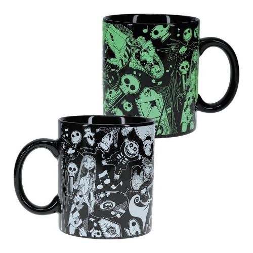 La tazza in ceramica nera si illumina al buio. È ricoperto di personaggi come jack skellington, sally, oogie boogie. Sorseggia il tuo drink in una stanza buia e guarda i personaggi prendere vita!
