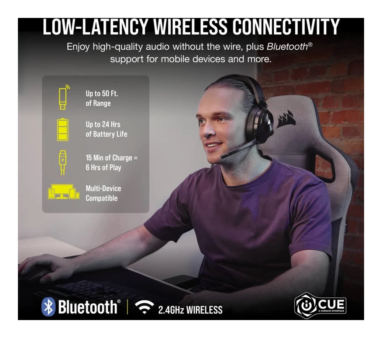 La cuffia gaming con microfono CORSAIR HS55 WIRELESS combina un sistema audio wireless con connessione da 2,4 GHz a bassa latenza, Bluetooth e Audio Dolby Surround 7.1 su PC e Mac con un telaio leggero, che offre un comfort essenziale per l’utilizzo quotidiano.