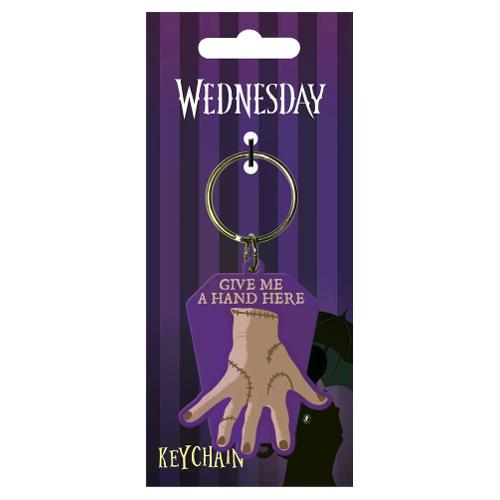 Porta con te un tocco spettrale di wednesday addams ovunque tu vada con questo portachiavi del mercoledì! Caratterizzato da un iconico gesto della mano che simboleggia sotto i mondi "give me a hand here" in caratteri viola. Questo portachiavi è un ottimo modo per mostrare il tuo lato oscuro interiore e portare con te un po' di umorismo oscuro ovunque tu sia.