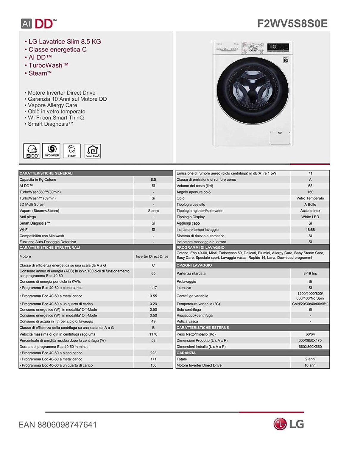 Lavatrice 8,5 Kg SERIE V5 F2Wv5S8S0E Ai Dd Bianco e Nero classe C 1200giri/min