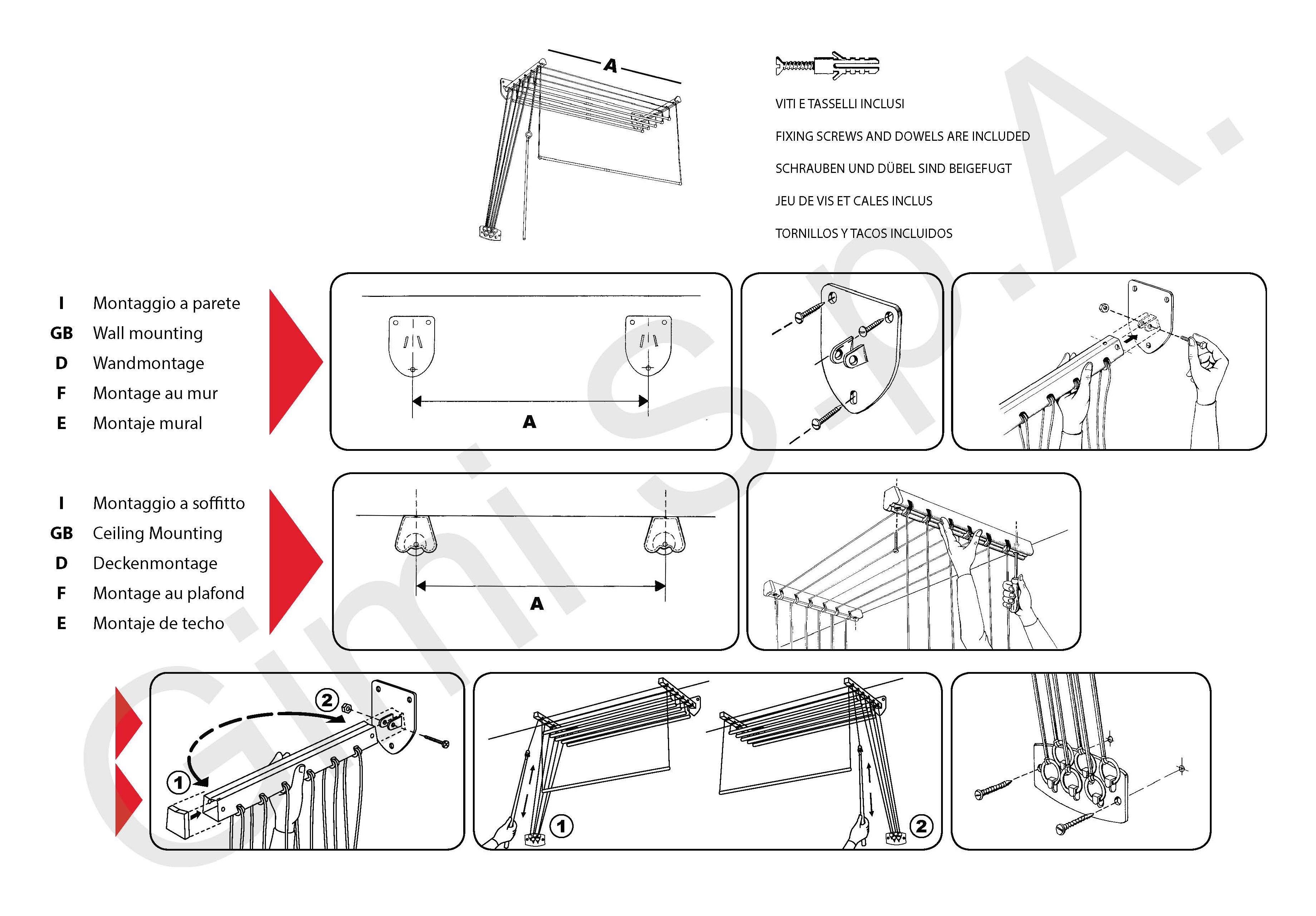 Stendibiancheria da parete e soffitto con 6 barre resistenti. Le barre xxl evitano le pieghe sui capi asciutti. E' inclusa l'asticella saliscendi.