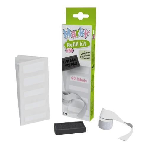 Questo kit di ricarica marky include tutto il necessario per continuare a godere del tuo timbro personalizzato- un tampone di inchiostro nero di alta qualità, 1 metro di nastro termoadesivo speciale per tessuti scuri e 40 etichette aggiuntive in due diverse dimensioni, perfette per tutte le tue esigenze di marcatura. Come il timbro, i ricariche di marky mantengono la loro resistenza all'acqua e ai lavaggi frequenti. L'inchiostro nero e il nastro termoadesivo assicurano che i marchi rimangano chiari e visibili, anche dopo molti cicli di lavaggio, mantenendoli sempre nitidi. Con il kit di marky, puoi prolungare l'uso del tuo timbro, garantendo che tu possa marchiare tutte le volte che ne hai bisogno. È la scelta perfetta per continuare a organizzare e personalizzare tutti i vestiti e gli oggetti dei tuoi figli. L'inchiostro di marky è facile da inserire e utilizzare. È ideale per marchiare una vasta gamma di superfici e oggetti, dall'abbigliamento al materiale scolastico. Riconosci i tuoi oggetti a colpo d'occhio!