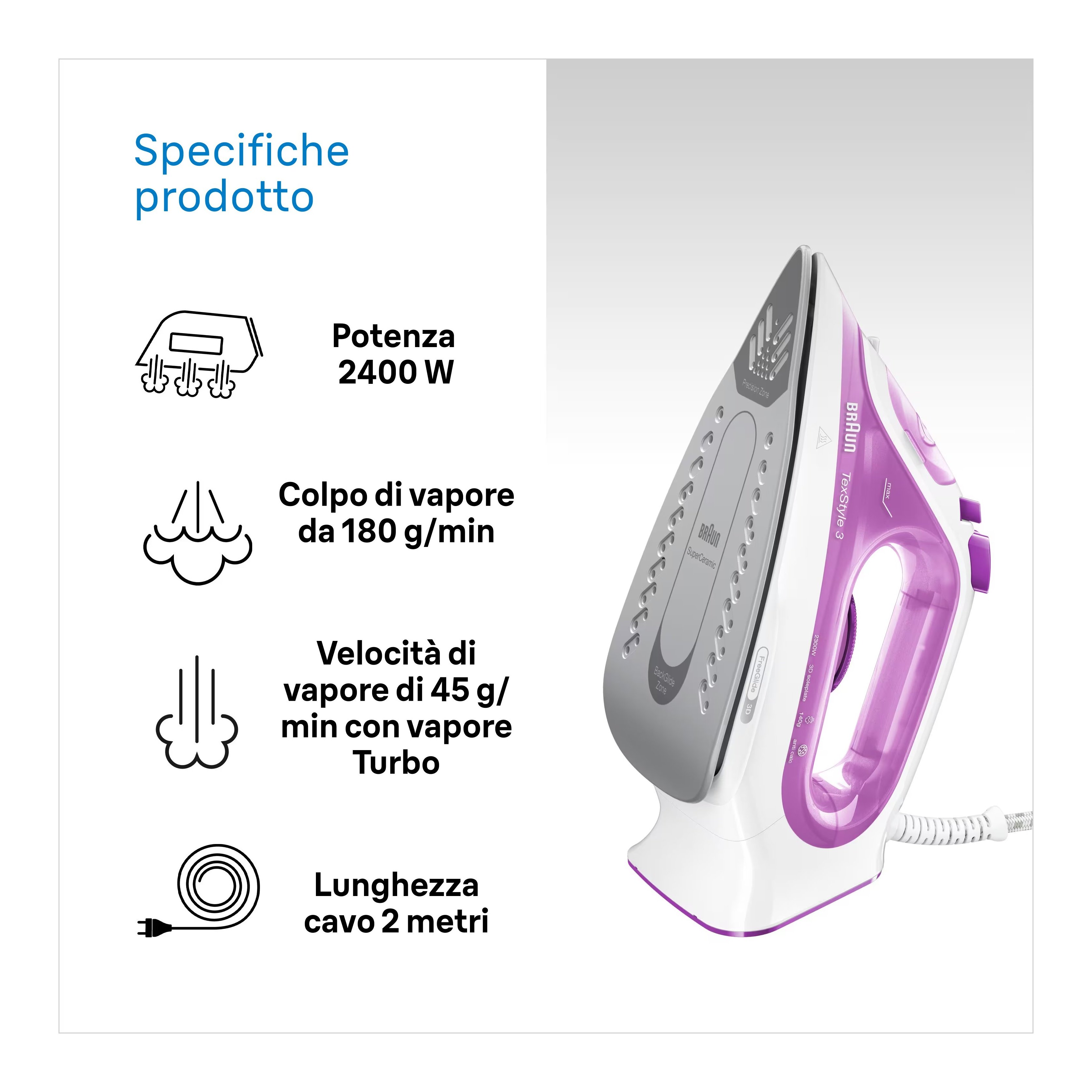 Il Braun TexStyle 3 è stato aggiornato con un nuovo look, più potenza e prestazioni di vapore migliori. Dotato ora della prima tecnologia al mondo FreeGlide 3D per una scorrevolezza a 360°. La piastra brevettata incurvata verso l'alto garantisce una scorrevolezza a 360° su qualsiasi tessuto e qualsiasi ostacolo, anche all'indietro.
