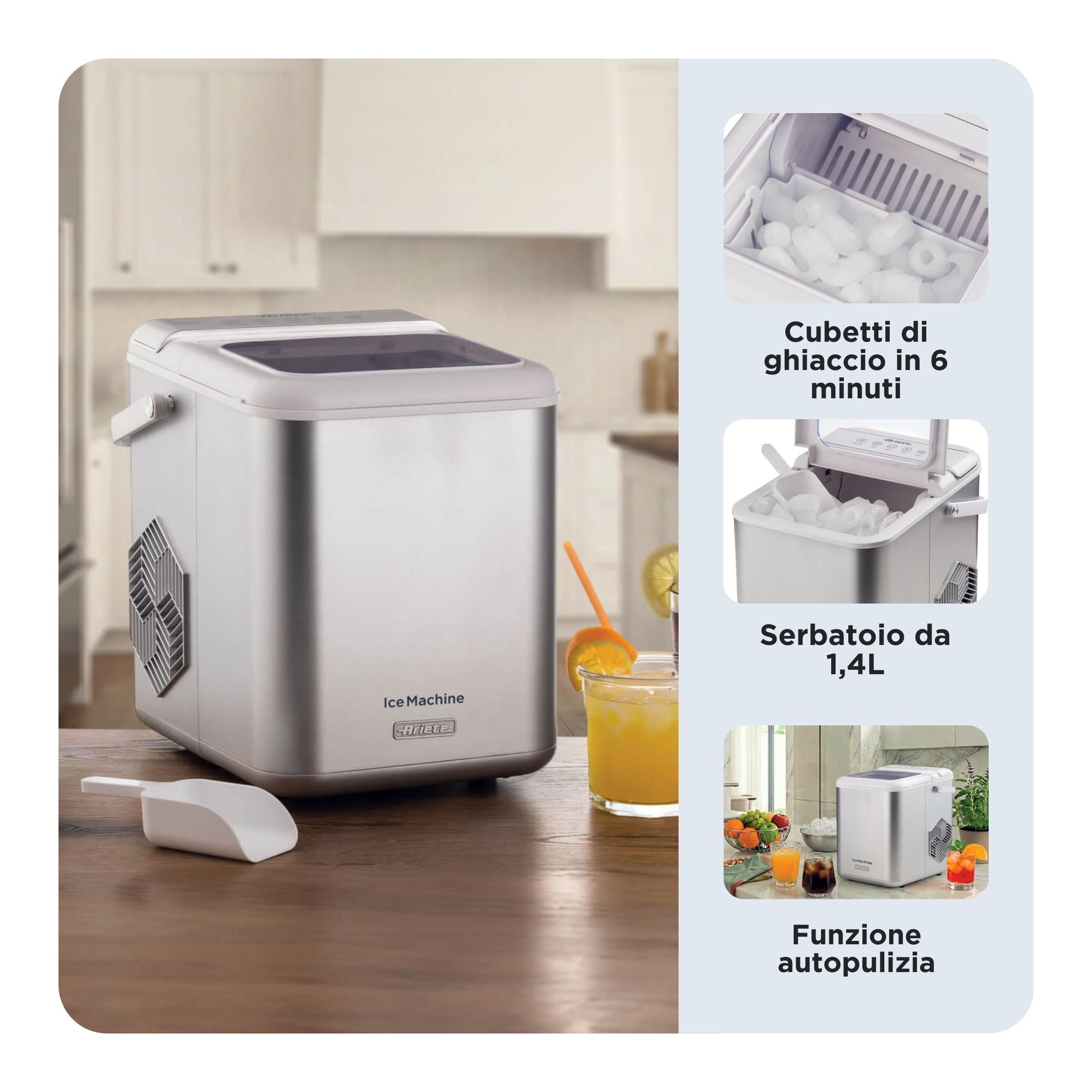 Mai più senza ghiaccio alle tue feste: Ice Machine è la macchina per fare il ghiaccio compatta e potente: la soluzione ideale per casa, ufficio o camper. Grazie al compressore ad alta efficienza, produce i primi cubetti in meno di 10 minuti, garantendo bevande sempre fresche senza lunghe attese. Ice Machine permette di ottenere 9 cubetti di ghiaccio in 6-10 minuti scegliendo tra 2 dimensioni disponibili: piccoli (per frullati e per raffreddare velocemente bevande in bottiglia) e grandi (ideali per cocktail che non devono annacquarsi) .