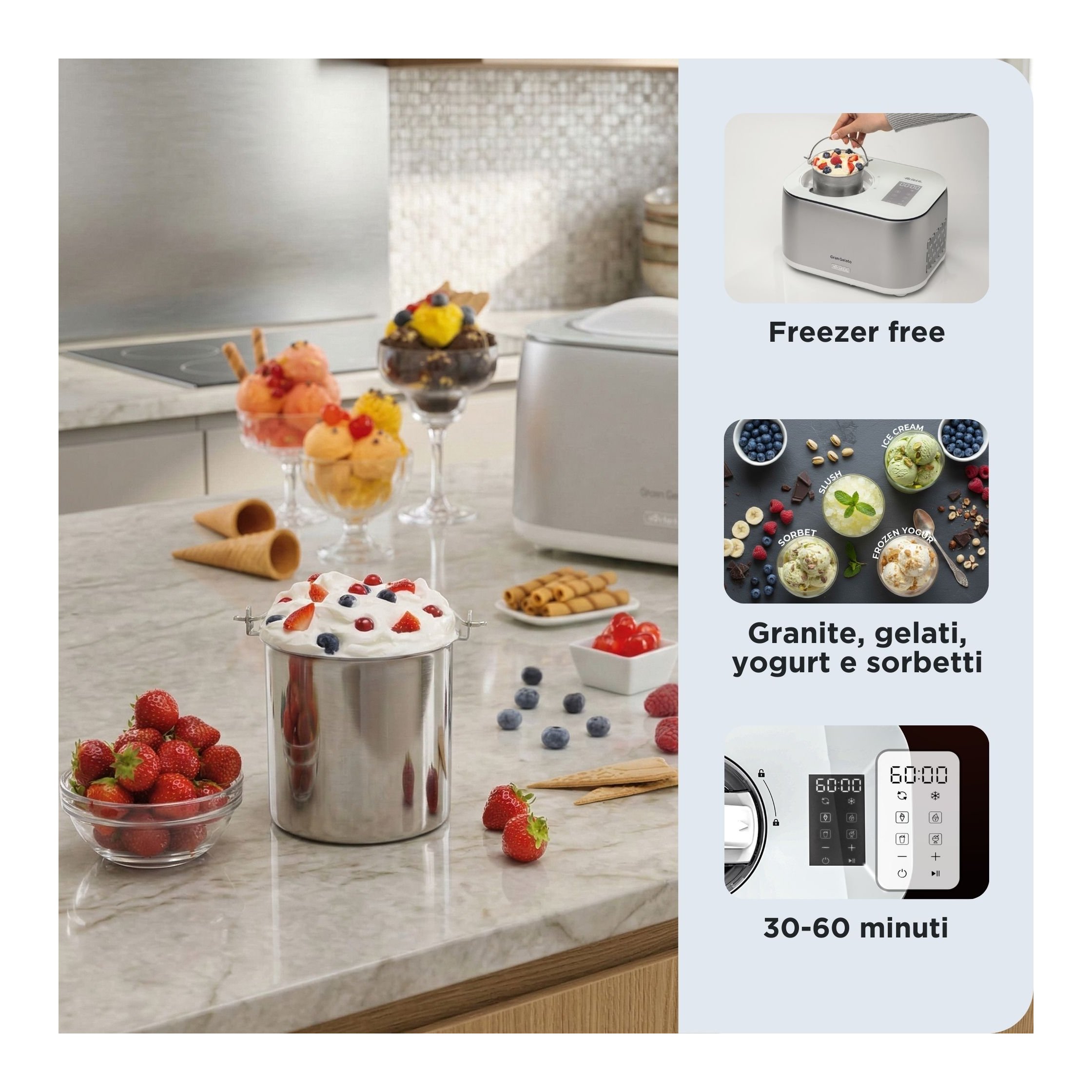 Gran Gelato 4in1 è la gelatiera auto refrigerante e l'alleata perfetta per chi ama i dessert freschi e genuini ma non vuole complicazioni. Grazie al compressore integrato, dimentica di dover pre-congelare il cestello in freezer per ore: questa macchina è sempre pronta all'uso per soddisfare la tua voglia di dolce in pochi minuti.