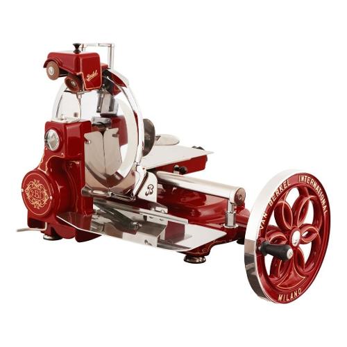Affettatrice a volano B114 per salumeria, adatta a tutti i tipi di salumi. Dotata di lama da 31,9 cm, è costruita in alluminio verniciato con particolari in acciaio inox.