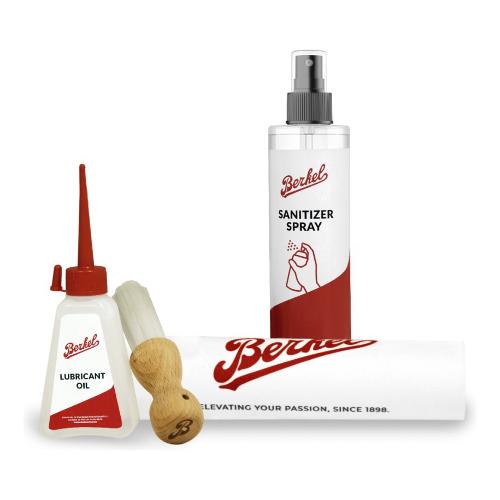 l Cleaning Kit è stato ideato e studiato su misura per una pulizia e manutenzione accurata. Include: Scatola realizzata con cartone Crush: Rosso naturale derivato dai noccioli delle ciliegie. Panno medio: ULTRAMICROFIBRA lipotrofico resistente ai lavaggi con logo Berkel a contrasto. Flacone spray igienizzante mani e superfici 250 ml. Boccetta Olio 50 ml. Spazzola pulizia con setole delicate. Il kit è utilizzabile sia su Volano e affettatrici elettriche!
