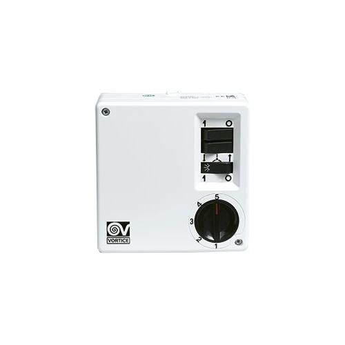 Gruppo comandi per ventilatori a soffitto Vortice. Alimentazione monofase 220-240 V / 50 Hz. Installazione a parete, trasformabile ad incasso con il kit opzionale SCBRR5/5L/M. Colore bianco. Carico massimo ammissibile: 100 W. Funzioni: On/Off, Selezione velocità (5 alternative), Selezione del senso di rotazione.
