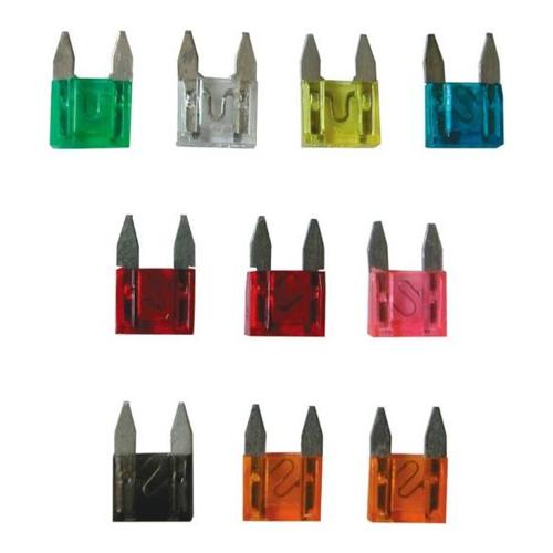 10 fusibili micro lamellari assortiti: 1 da 30A, 1 da 25A, 1 da 20A, 1 da 15A, 2 da 10A, 1 da 4A, 1 da 7,5A, 2 da 5A.