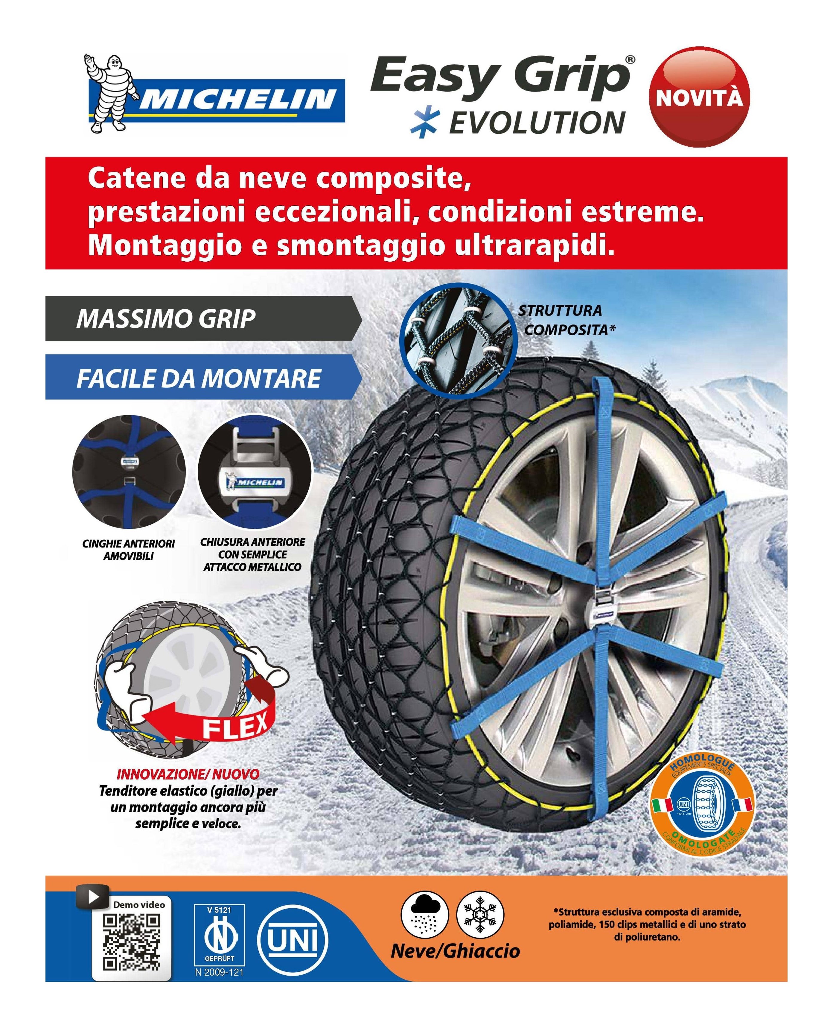 Realizzata in struttura composta da aramide, poliamide, 150 clips metallici e da uno strato di poliuretano. larga banda tessile e minimo spessore interno per una migliore tenuta sulla ruota.sistema catarifrangente nvs per migliore visibilità laterale veicolo