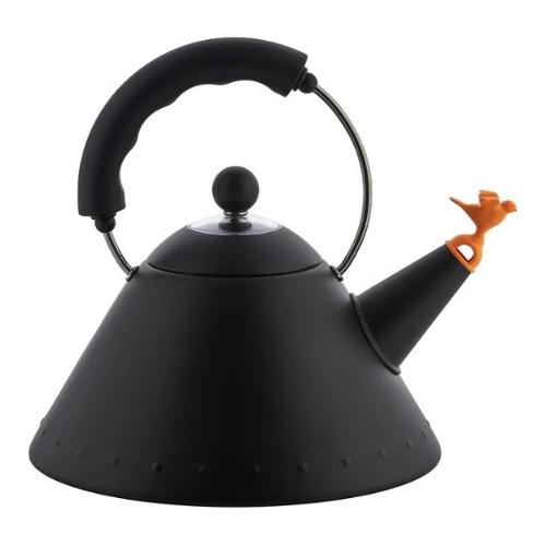Nato dal desiderio di Michael Graves di dare vita a un “design americano”, il bollitore 9093 celebra nel 2025 i suoi primi quarant’anni. Per l’occasione, una nuova versione in un’elegante veste completamente nera rende omaggio a questo oggetto internazionalmente riconosciuto come una delle icone del design contemporaneo. Il nero intenso esalta l’inconfondibile disegno del bollitore, creando un vivace contrasto con l’arancione dell’uccellino, tratto dalla palette cromatica di Graves.