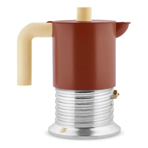 Adatta a tutti i tipi di piani di cottura, inclusa l’induzione, la caffettiera Vite è una piccola scultura industriale. La caldaia riprende la forma di una vite, richiamo diretto al gesto che ne accompagna l’uso; il contrasto fra l’alluminio naturale e il colore del serbatoio sottolinea ulteriormente questo riferimento. Manico e pomolo in resina termoplastica