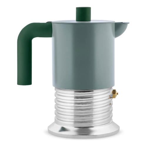 Adatta a tutti i tipi di piani di cottura, inclusa l’induzione, la caffettiera Vite è una piccola scultura industriale. La caldaia riprende la forma di una vite, richiamo diretto al gesto che ne accompagna l’uso; il contrasto fra l’alluminio naturale e il colore del serbatoio sottolinea ulteriormente questo riferimento. Manico e pomolo in resina termoplastica