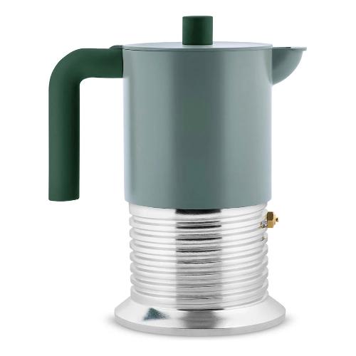 Adatta a tutti i tipi di piani di cottura, inclusa l’induzione, la caffettiera Vite è una piccola scultura industriale. La caldaia riprende la forma di una vite, richiamo diretto al gesto che ne accompagna l’uso; il contrasto fra l’alluminio naturale e il colore del serbatoio sottolinea ulteriormente questo riferimento. Manico e pomolo in resina termoplastica