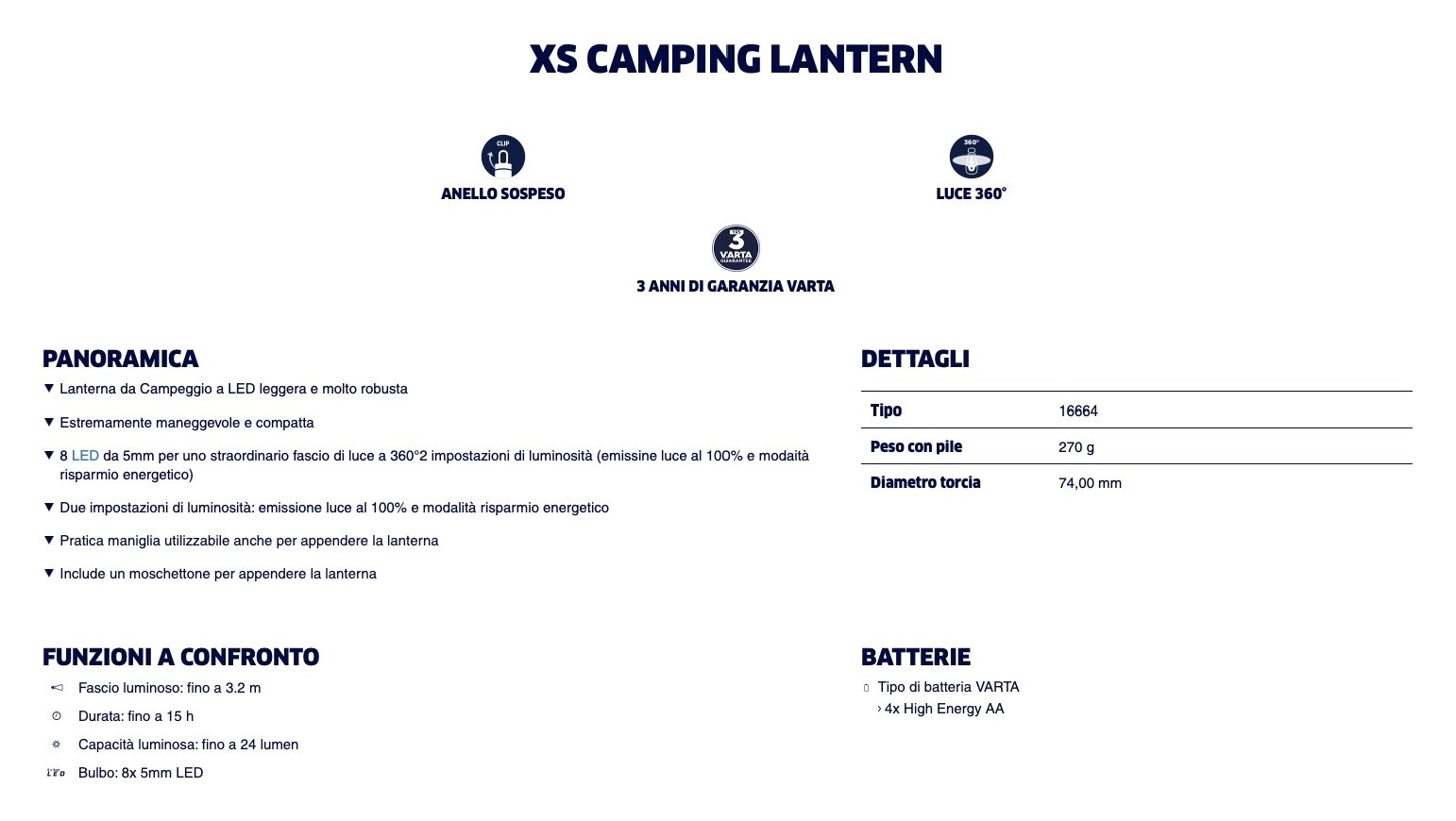 Lanterna da campeggio a led leggera e molto robusta. Estremamente maneggevole e compatta per uno straordinario fascio di luce a 360° . 2 impostazioni di luminosità (emissione luce al 100% e modalità risparmio energetico)