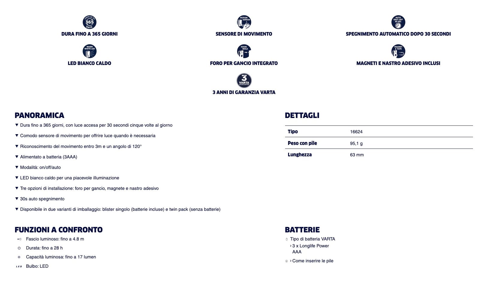 Indipendentemente dal tipo di luce, le luci speciali con caratteristiche ben studiate offrono una soluzione affidabile per ogni occasione d'uso. Dura fino a 365 giorni se la luce viene accesa per 30 secondi cinque volte al giorno. Comodo sensore di movimento per offrire luce ogni volta che è necessario nel buio. Riconoscimento del movimento entro 3 m e un angolo di 120. Modalità: on/off/auto. Tre opzioni di installazione: foro per gancio, magnete e nastro adesivo. 30 s spegnimento automatico