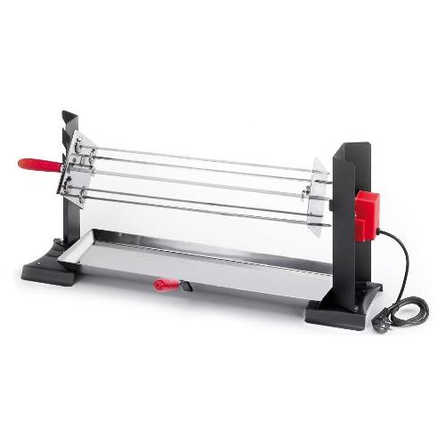 I supporti sono realizzati in lamiera di acciaio verniciato e hanno più spazi per inserire lo spiedo. La leccarda in inox AISI 430 va posta sulla base sottostante lo spiedo e raccoglie l’intingolo da riutilizzare successivamente. È di facile pulizia e garantisce un’ottima durata. Il girarrosto è dotato di motore elettrico 220V con 2 giri al minuto, omologato e certificato. La raggiera, prodotta in “triangolini scarnito” di acciaio, funziona “a satellite” ed ogni lancia gira anche su se stessa. Inoltre ogni lancia è asportabile e inseribile singolarmente facilitando sia la preparazione che il servire in tavola. Con lance lunghe 46cm, questo modello è consigliato per 8 / 10 persone. Può essere dotato di molti accessori come la griglia girevole, le grigliette per il pesce, il kit porta-stinchi di maiale o per galletti.