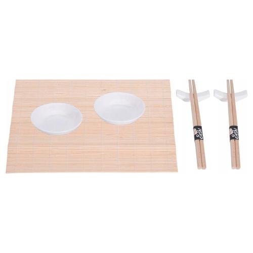 Include: 1 tappetino da portata in bambù con dimensioni 25x21 cm 2 piatti in porcellana con dimensioni 8x8x2 cm, 2 porta bacchette, 2 paia di bacchette in bambù con una lunghezza di 24 c.m