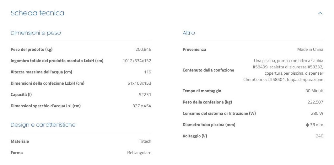 Include: Pompa filtro a sabbia, scaletta di sicurezza, telo di copertura, dosatore cloro ChemConnect e toppa di riparazione.
