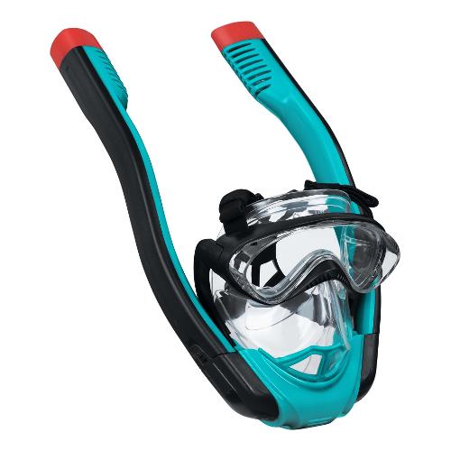 La maschera subacquea completa bestway® flowtech™ convince soprattutto per il suo efficiente sistema di flusso d'aria! È l'ideale per tutte le avventure di snorkeling subacqueo. Tecnologia one-way air flow: questa innovativa combinazione di maschera da sub e boccaglio di nuova generazione ti consente di respirare in modo naturale attraverso naso e bocca durante l'immersione. Inspirare l'aria fresca attraverso uno snorkel ed espirare la co2 attraverso l'altro. Tecnologia dry-top: la tecnologia dry-top impedisce all'acqua di entrare nello snorkel e quindi nella maschera e nelle vie respiratorie quando è immersa. Ciò è garantito da uno speciale meccanismo di bloccaggio automatico posto sulla parte superiore dello snorkel. Se dovesse penetrare dell'acqua nello snorkel, questa può essere facilmente rimossa grazie alla valvola di sfiato. Vestibilità comoda: la morbida struttura in silicone garantisce una vestibilità comoda e consente la respirazione naturale attraverso naso e bocca, nonché la compensazione della pressione durante l'immersione.