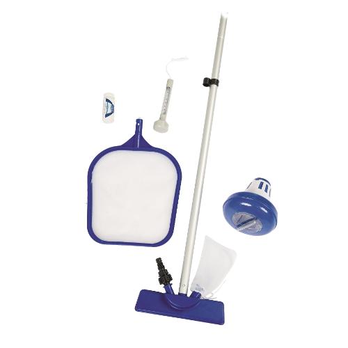 Tutto l’occorrente per mantenere la tua piscina fuori terra in perfetta forma! Con questo kit potrai pulire facilmente sia in superficie sia in profondità, regolare il livello di cloro e riparare eventuali forature. Il set è compatibile con la maggior parte delle piscine fuori terra fino a 3,96 metri di diametro. Nella confezione troverai: asta con testine per aspiratore e skimmer, dosatore galleggiante per cloro, termometro, 50 strisce reattive, 9 toppe di riparazione rinforzate.