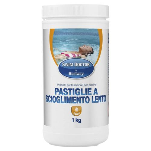 Cloro in pastiglie da 20 gr a lento scioglimento (acido tricloroisocianurico) con azione igienizzante, azzurrante e antialghe. È in grado di aumentare lentamente ma regolarmente il tasso di cloro, in modo da ossidare i microorganismi (batteri, funghi, alghe) presenti nella piscina. Le pastiglie possono essere messe nel cestello dello skimmer, nei dosatori a lambimento e nei dosatori galleggianti. Le quantità di utilizzo del prodotto dipendono dalle condizioni climatiche, dall’esposizione al sole, dalla frequentazione della vasca e dal tempo di funzionamento della pompa.